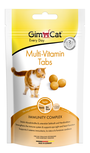 GimCat Multi-Vitamin Tabs stiprina augintinio imunitetą, palaiko normalią širdies funkciją ir regėjimą. Sudėtyje turi daug svarbių vitaminų ir vertingo beta-gliukano, kurie kartu stiprina ir palaiko katės imuninę sistemą; taurinas papildomai palaiko katės regėjimą ir širdies veiklą.