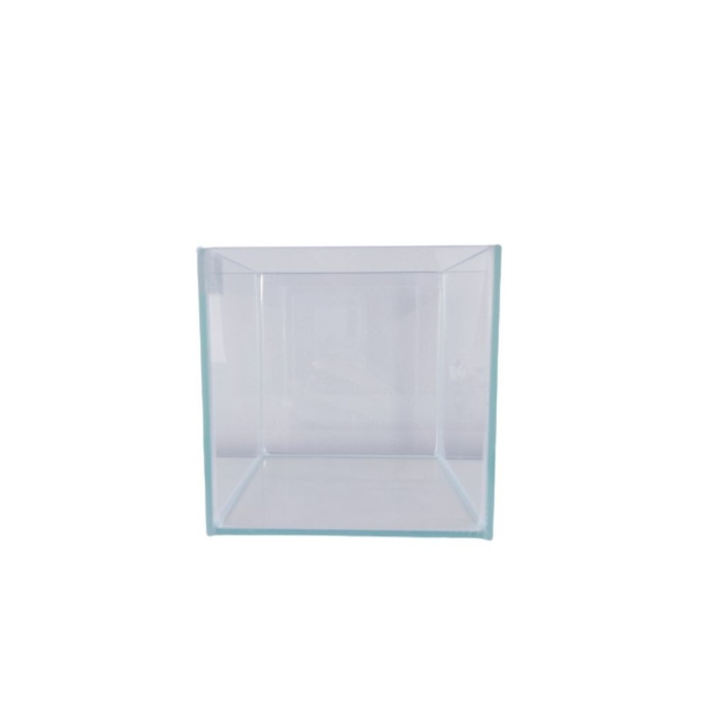 Stiklinis kubo formos akvariumas be įrangos. Visos akvariumo stiklų briaunos šlifuotos. Skaidri silikono spalva.