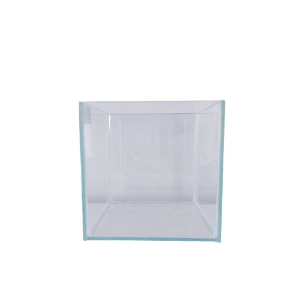 Stiklinis kubo formos akvariumas be įrangos. Visos akvariumo stiklų briaunos šlifuotos. Skaidri silikono spalva.