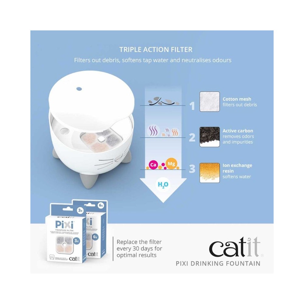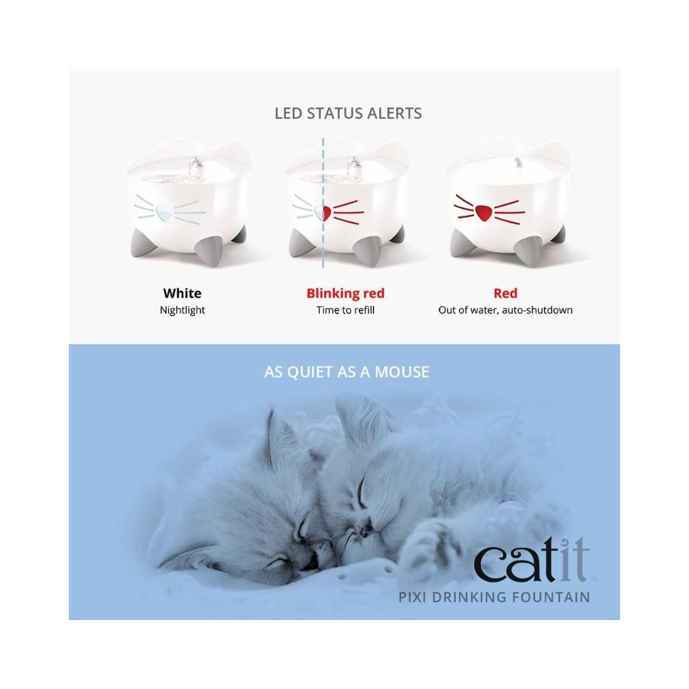 Šauniausias kačiukas!„Catit PIXI“ vandens fontanas tikrai atkreips visų dėmesį. Jis pasižymi katiniškomis savybėmis, kurios papildo fontano ergonomiškumą ir funkcionalumą. Mielos ausytės padeda apsisaugoti nuo vandens purslų, keturios žavios letenėlės leidžia lengvai paimti fontaną, o maža katės nosytė šviečia ir praneša, kada laikas papildyti fontaną.Ergonomiškos gėrimo galimybės, skatinančios jūsų katę gerti daugiauGėrimas nr. 1 – Unikalus snapelio priedasAr kada nors matėte, kaip jūsų katė bando gerti iš čiaupo nepatogiai pakreipus galvą į šoną? „Catit PIXI Fountain“ turi snapelio priedą, kuris sukuria lenktą vandens srovę. Ši funkcija leidžia jūsų katei patogiai gerti. Snapelio priedą lengva įdėti ir išimti, net kai fontanas veikia.Gėrimas Nr. 2 – Burbuliuojantis vanduo su sroveBe snapelio vanduo tarsi burbuliuos iš fontano ir toliau švelniai tekės žemyn į didelį dubenį priekyje.Gėrimas Nr.3 – Švelniai tekantis vanduoKadangi dubuo sulaiko vandenį, jūsų katė gali gerti kada tik nori, net kai Catit PIXI geriamąjį fontaną išjungsite. Šalia dubens yra lašelių surinkimo zona, kuri padeda nutekėjusiems vandens lašams tekėti atgal.Patogus ūsams fontano paviršius„Catit PIXI Fountain“ buvo sukurtas kuo didesniam gėrimo patogumui. Negilus jo paviršius neliečia jautrių katės ūsų, kai ši geria.Maloniai tyluCatit PIXI fontanas beveik neskleidžia garso. Taip yra todėl, kad fontano siurblys yra sumaniai pakabintas vandenyje ir nesiliečia į indą.LED nosis ir ūsai leidžia žinoti, kada reikia papildyti vandensAr žinojote, kad PIXI nosis ir ūsai šviečia? Šis vandens lygio langelis, panašus į katės nosį, patogiai parodo vandens fontano būklę ir sukuria žavingą naktinę šviesą!Balta nosis – nuolatinis apšvietimas (vandens pakanka)Mirksinti raudona nosis – laikas papildytiRaudona nosis – pasibaigęs vanduo, automatinis išsijungimasGeriamasis fontanas su trigubo veikimo filtravimu„Catit PIXI“ geriamajame fontanėlyje yra trigubo veikimo filtro pagalvėlė, kuri nuolat valo jūsų katės geriamąjį vandenį. Jis padeda pašalinti kvapus bei nešvarumus ir netgi suminkština vandenį, sumažindamas magnio ir kalcio kiekį. Dideliais kiekiais šie mineralai gali kauptis jūsų augintinio šlapimo takuose ir sukelti šlapimo takų ligas, kurios yra dažna kačių sveikatos problema.Savybės:Matmenys: 20,5 x 20,5 x 17 cmTalpa: 2,5 lSvoris: 678 gSpalva: rožinėGalia: USB išvestis su nuolatinės srovės 5 V 1A adapteriu, energijos naudojimas < 1 WPartijos nr.: žr. ant pakuotės.CE sertifikatas2 metų garantijaGamintojas: CatitFontano valymas:Prekių nuotraukos yra iliustracinio pobūdžio. Prekės aprašymas yra bendro pobūdžio ir ne visos savybės gali būti paminėtos. Ant produkto pakuotės nurodoma informacija yra detalesnė. Rekomenduojame vadovautis informacija esančia ant prekės pakuotės. Elektroninėje akvanamai.lt parduotuvėje skelbiamos kainos, akcijos, nuolaidos gali skirtis nuo kainų, akcijų, nuolaidų, taikomų fizinėse AKVANAMAI parduotuvėse.