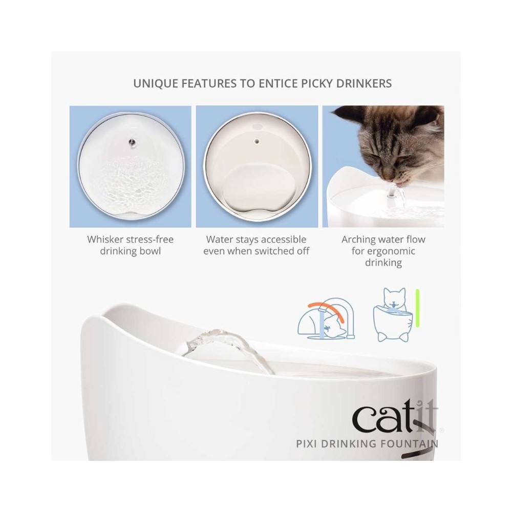 Geriamasis fontanas su trigubo veikimo filtravimu„Catit PIXI“ geriamajame fontanėlyje yra trigubo veikimo filtro pagalvėlė, kuri nuolat valo jūsų katės geriamąjį vandenį. Jis padeda pašalinti kvapus bei nešvarumus ir netgi suminkština vandenį, sumažindamas magnio ir kalcio kiekį. Dideliais kiekiais šie mineralai gali kauptis jūsų augintinio šlapimo takuose ir sukelti šlapimo takų ligas, kurios yra dažna kačių sveikatos problema.