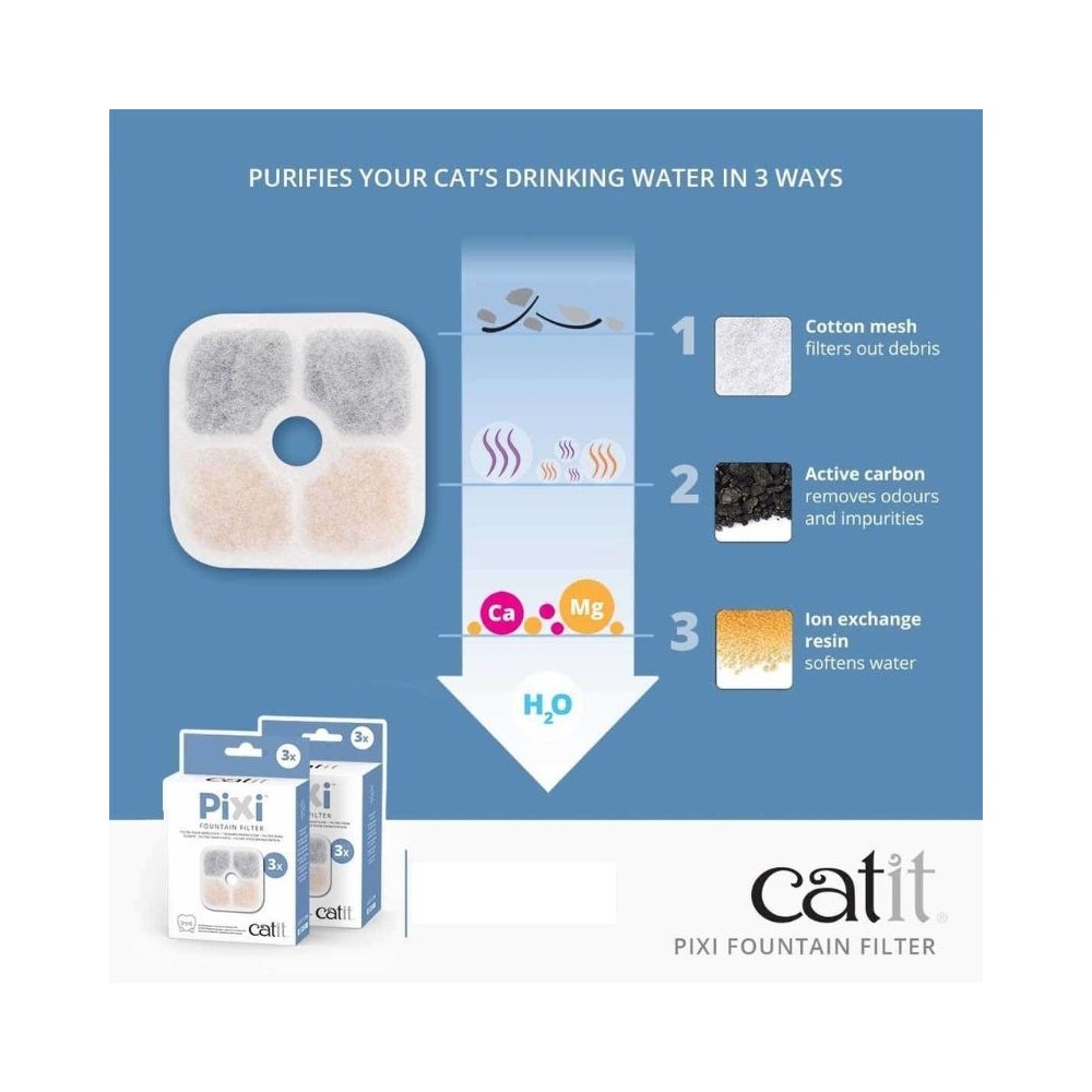 Catit PIXI fontano filtras išvalys jūsų katės geriamąjį vandenį 3 būdais. Jis išfiltruoja šiukšles, pašalina kvapus bei nešvarumus ir netgi suminkština vandenį sumažindamas magnio ir kalcio kiekį. Dideliais kiekiais šie mineralai gali kauptis jūsų katės šlapimo takuose ir sukelti šlapimo takų ligas.