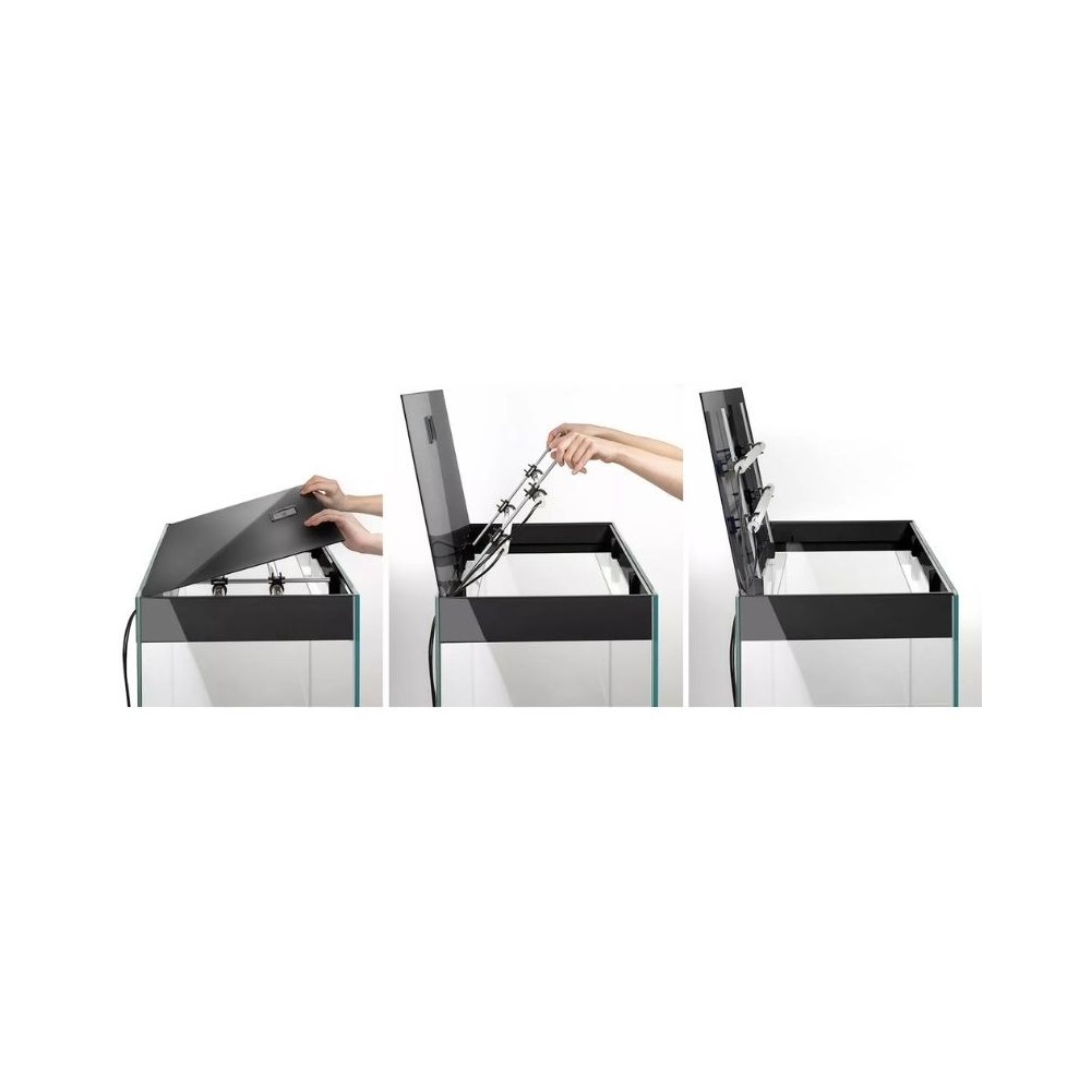 Akvariumas Glossy” turi integruotą dangtį ir „Aquael Leddy Tube Sunny Day&Night 2.0” apšvietimą. Šviesos moduliai sumontuoti ant specialaus laikiklio, todėl, kai reikia patekti į akvariumo vidų, dangtis ir laikiklis pakeliami ir vertikaliai pastatomi ant galinės sienelės. Šis sprendimas leidžia nukreipti apšvietimą į akvariumo vidų, todėl visus akvariumo priežiūros darbus galima atlikti esant geram apšvietimui.