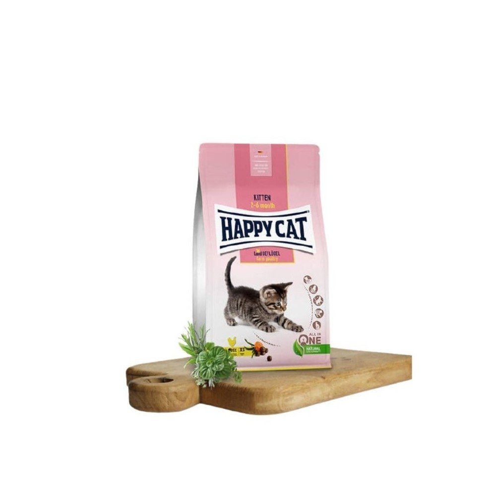 „Happy Cat Kitten LandGeflugel“ sudėtyje – aukštos kokybės mėsa. Lengvai virškinamas maistas su paukštiena yra specialiai pritaikytas mažų kačiukų poreikiams. Skaniame pilnaverčiame maiste yra viskas, ko reikia harmoningam kačiuko augimui ir imuninės sistemos apsaugai. Maistas ypač mažomis granulėmis. Tinka kačiukams nuo 5 savaičių iki 6 mėnesių amžiaus.