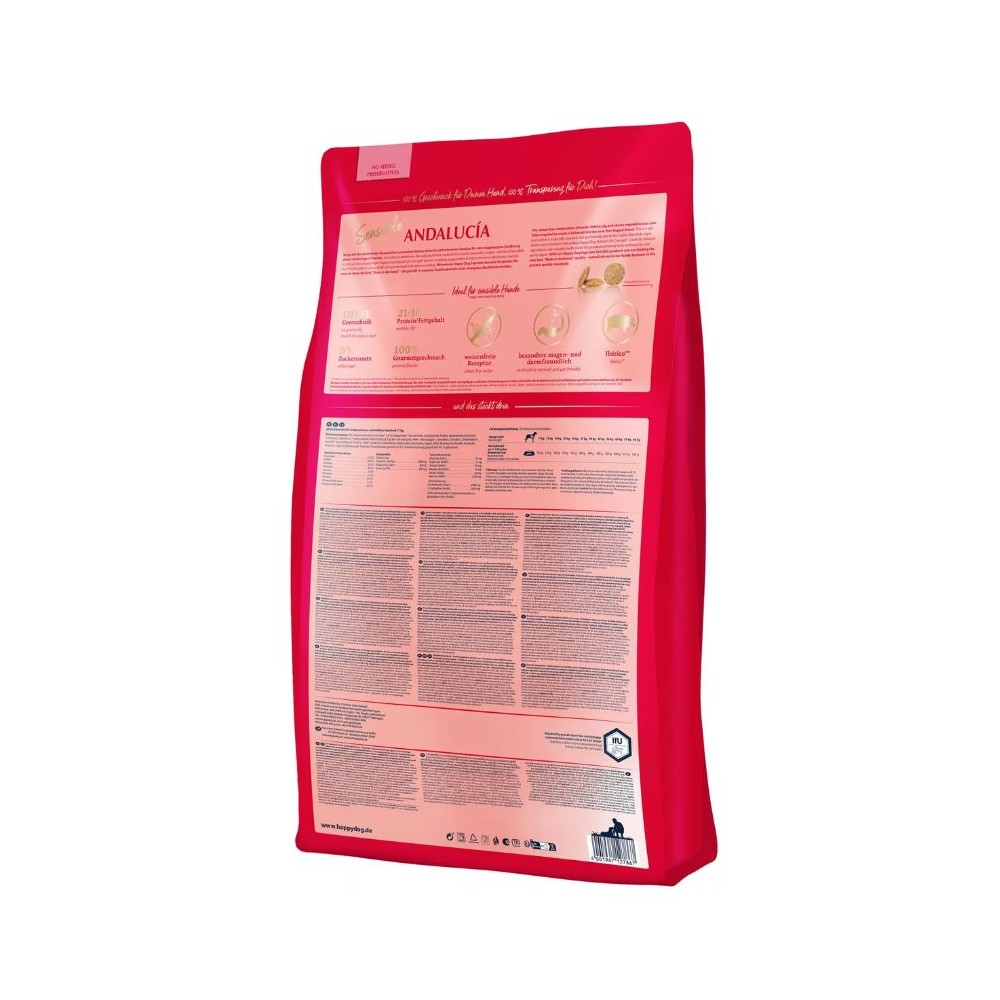Happy Dog Sensible Andalucia – visavertis maistas suaugusiems vidutinių ir didelių veislių alergiškiems šunims. Šis sausas maistas yra sukurtas šunims, turintiems jautrų skrandį ir žarnyną. Aukščiausios kokybės sauso maisto gabalėliai paskaninti Iberijos kiaulių baltymais ir Naujosios Zelandijos moliuskais yra skirti vidutinių ir didelių veislių šunims. Sudėtis praturtinta omega-3 ir omega-6 riebalų rūgštimis, todėl Jūsų augintinis galės džiaugtis ne tik sveiku virškinamuoju traktu, bet ir žvilgančiu kailiu bei sveika oda. O Naujosios Zelandijos mosliukuose esančios medžiagos užtikrins sveikus sąnarius.
