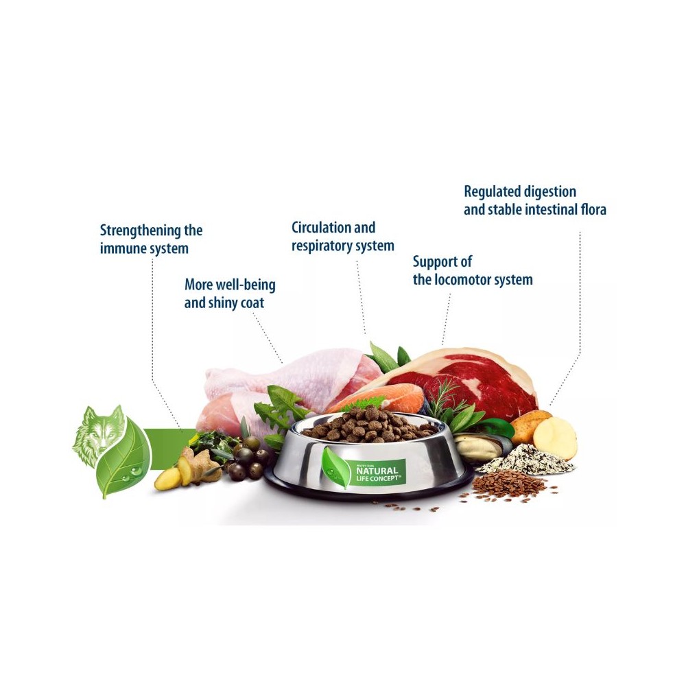 Sudėtis: augaliniai produktai, ėrienos baltymai (15%), ryžiai, kukurūzų miltai, kukurūzai, ryžių baltymai, hidrolizuoti baltymai, saulėgrąžų aliejus, kalio chloridas, mielės, natrio chloridas, jūrų dumbliai, linų sėmenys, moliuskų mėsa, mielės (ekstraktas). Analitinės sudedamosios dalys: žali baltymai 17,5%, žali riebalai 5,5%, žalia ląsteliena 1,5%, žali pelenai 8,0%, drėgnis 14,0%. Priedai/1 kg: vitaminai: vitaminas A (3a672a) 14000 TV, vitaminas D3 (3a671) 865 TV, taurinas (3a370) 400 mg. Mikroelementai: geležis (geležies II sulfatas, monohidratas 3b103) 40 mg, varis (vario II sulfatas pentahidratas 3b405) 9 mg, cinkas (cinko oksidas 3b603 75 mg, cinko chelatas iš amino rūgščių 3b606 10 mg) 85 mg, manganas (manganao II oksidas 3b502) 21 mg, jodas (kalcio jodatas, bevandenis 3b202) 1,5 mg, selenas (natrio selenitas 3b801) 0,1 mg. Antioksidantai, tokoferolio ekstraktas iš augalinių aliejų 1b306(i).