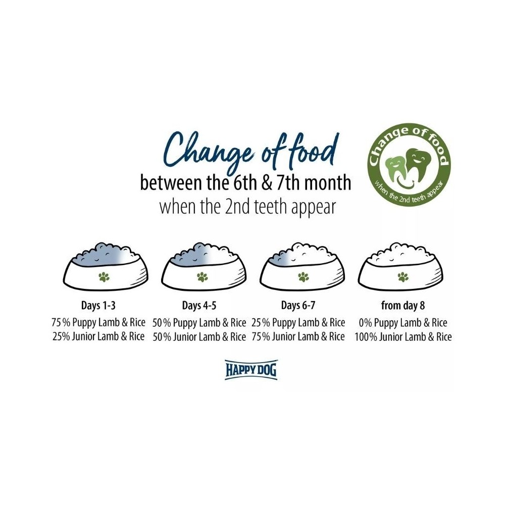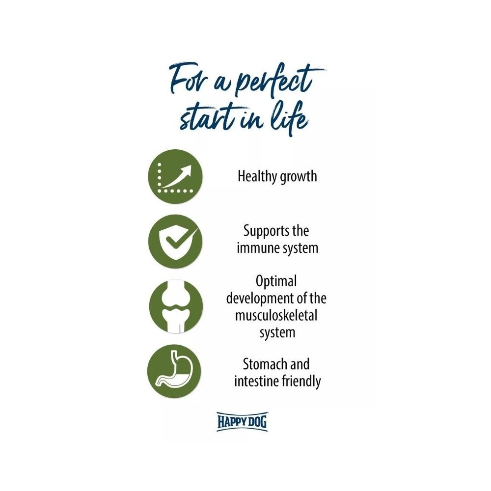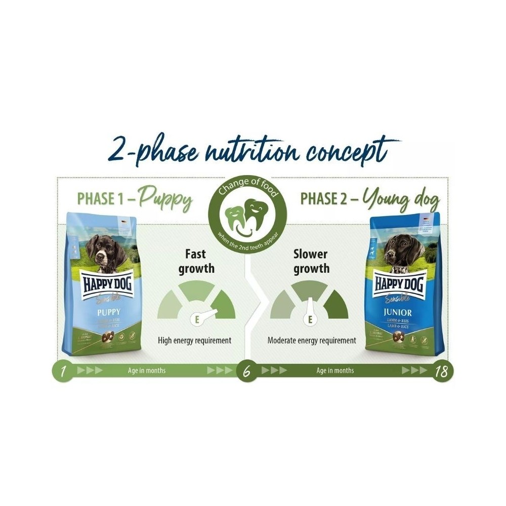 Happy Dog Sensible Junior Lamb & Rice sauso maisto sudėtis yra visiškai be glitimo, paukštienos ar bulvių. Baltymais turtinga ėriena papildyta lengvai virškinamais ryžiais, Naujosios Zelandijos midijomis (sąnariams) ir žolelėmis. Dėl lengvai toleruojamos sudėties maistas tinka net jautrią virškinimo sistemą turintiems jauniems šunims.
