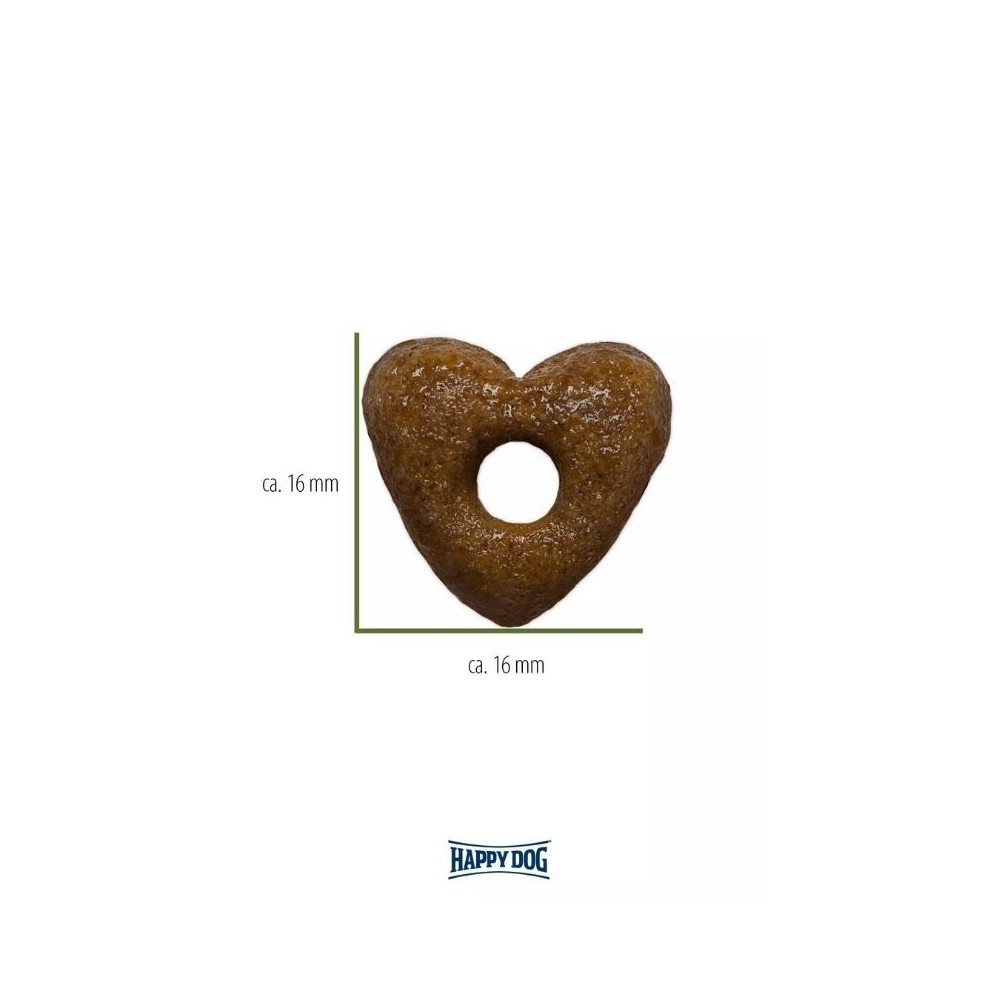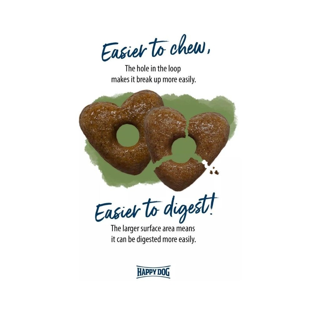 Visi HappyDog Young gaminiai gaminami širdelės formos, kurių viduryje yra skylutė. Tikslas – sukurti lengvai virškinamą šunų maistą. Dėl skylutės smulkūs gabalėliai greičiau suyra valgant – ir jūsų šuniui lengviau kramtyti. Didesnis paviršiaus plotas taip pat leidžia virškinimo sultims geriau apgaubti maistą skrandyje.