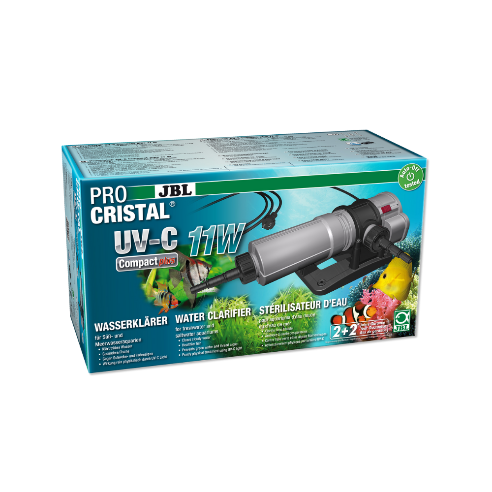 Produkto pakuotėje rasite: JBL „ProCristal Compact UV-C“ 11 W sterilizatorių, 2 m laidą, 11 W UVC lempą, G23 kištuką, antgalius, skirtus 16-19 mm žarnelėms, 90° plastikinė jungtis.