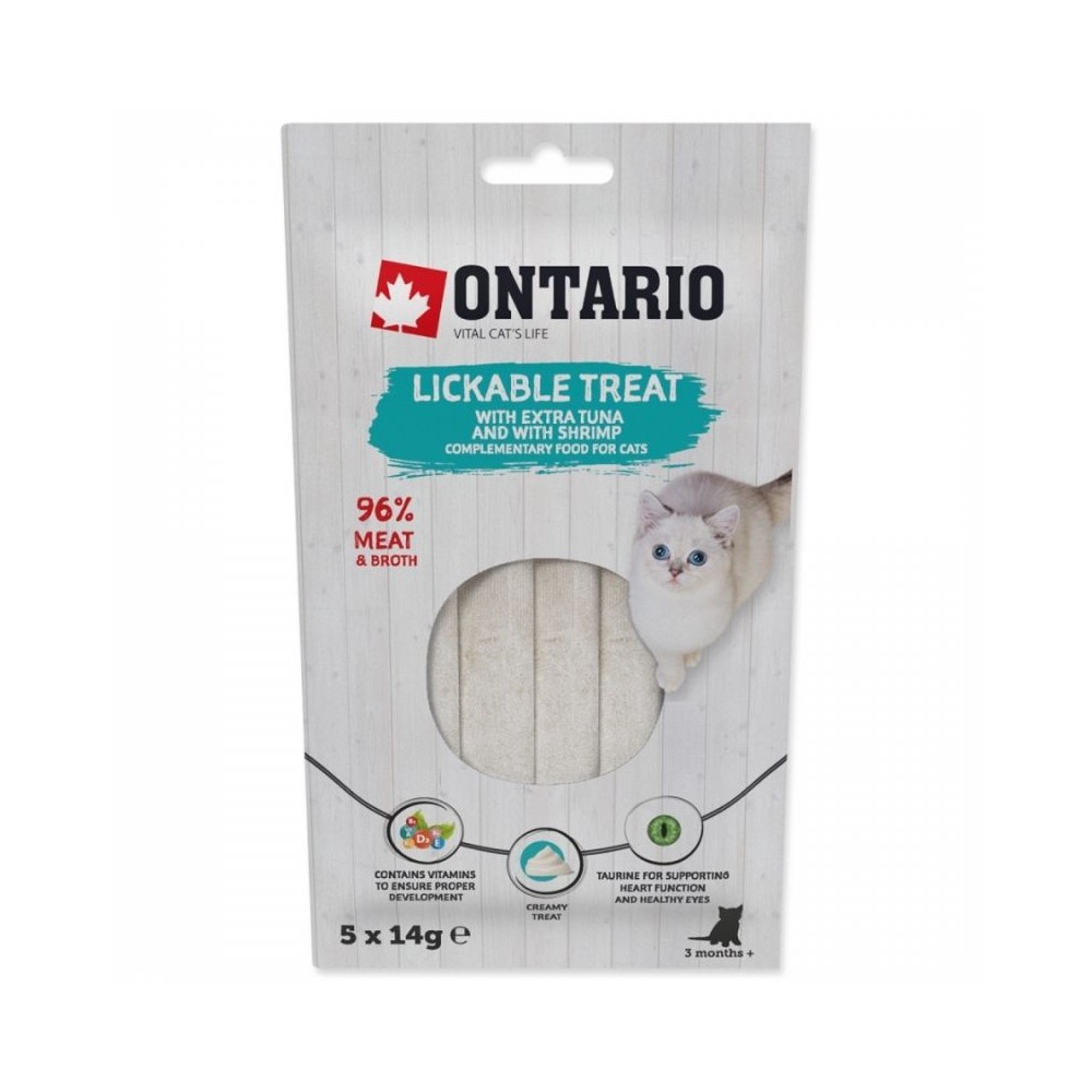Ontario laižomi skanėstai supakuoti patogioje penkių 14 g tūbelių pakuotėje, kad pasta būtų šviežia ir paruošta patiekti. Katę galite šerti tiesiai iš tūbelės, ant laižymo kilimėlio, kitų interaktyvių žaislų arba naudoti sauso maisto skoniui pagerinti, jei katė jo atsisako.