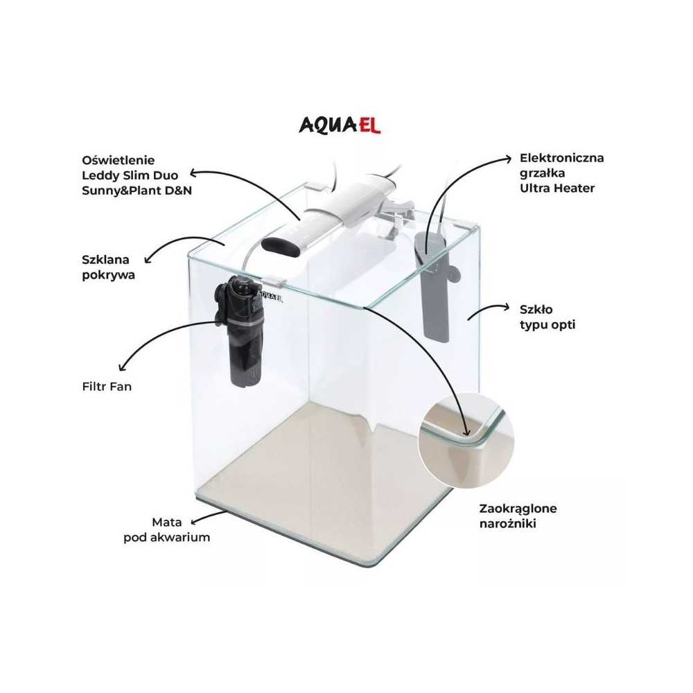 Tinkamu akvariumo filtravimu, temperatūra ir apšvietimu pasirūpins komplekte esantys Aquael priedai.