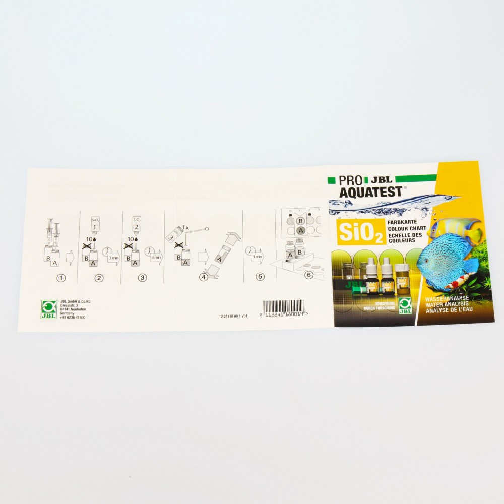 Naudojimas:1. Praskalaukite mėgintuvėlius ir švirkštą tiriamuoju vandeniu. 2. Abu mėgintuvėlius užpildykite tiriamuoju vandeniu, po 10 ml. Naudokite švirkštą.3. Į tiriamąjį mėgintuvėlį įlašinkite 10 lašų reagento Nr. 1, gerai sumaišykite ir palikite 3 minutėms. Tada įlašinkite 10 lašų reagento Nr. 2, vėl gerai sumaišykite ir palikite 3 minutėms. Galiausiai, įberkite 1 kaušelį reagento Nr. 3, užkimškite mėgintuvėlį kamšteliu ir gerai išmaišykite, kol milteliai ištirps. Palikite 3 minutėms, kad išryškėtų spalva. 4. Abu mėgintuvėlius įstatykite į pilką stovelį. Apačioje mėgintuvėlis su reagentu, viršuje, ties V formos įpjova, mėgintuvėlis be reagento.5. Spalvų skalę pasidėkite taip, kad balti rutuliukai būtų apačioje, o spalvoti – viršuje.6. Stovelį su mėgintuvėliais stumkite per skalę, kol abiejų mėginių spalvos bus panašiausios viena į kitą. Tai ir bus tiriamo vandens silikatų kiekis.