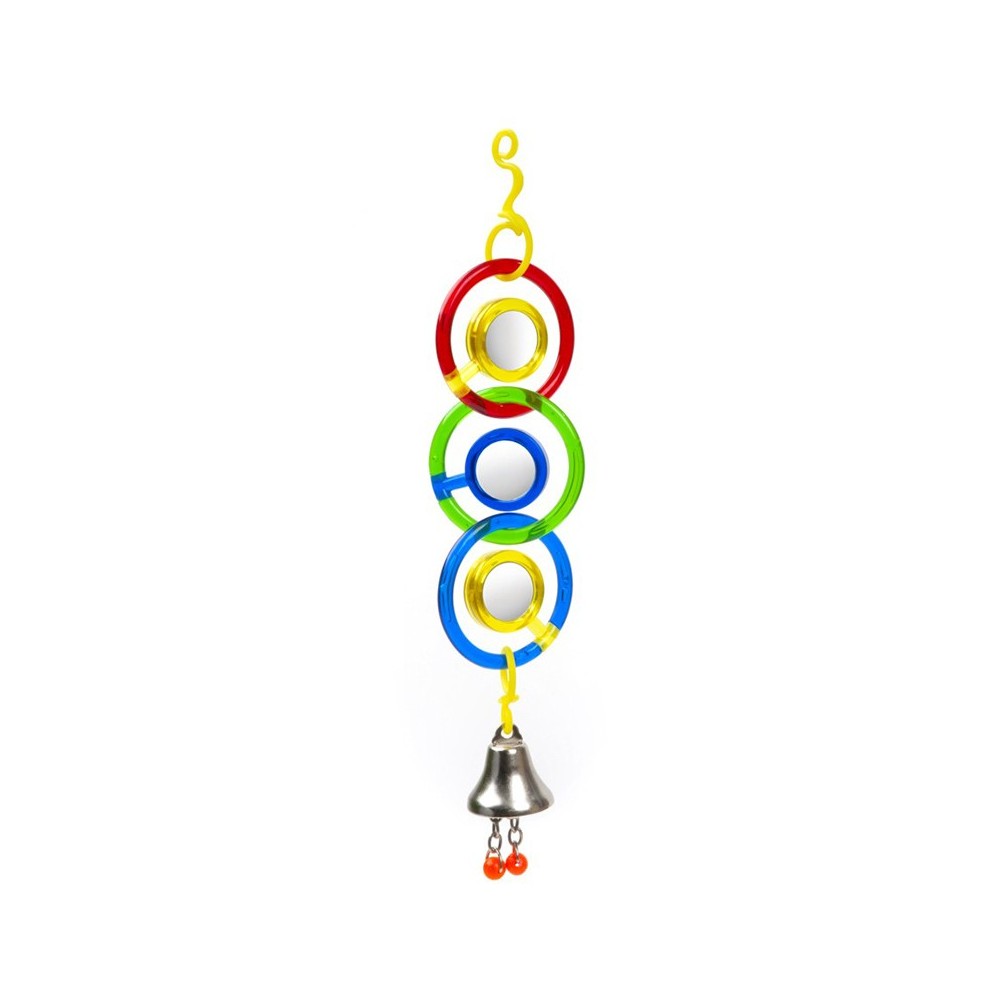 Žaislas paukščiams žiedai su veidrodėliais ir varpeliu. Spalvingas ir švelniai skambantis. Ilgis – 24,5 cm, žiedų skersmuo – 5 cm. Pagamintas iš kokybiškos plastmasės. Lengvai tvirtinamas.